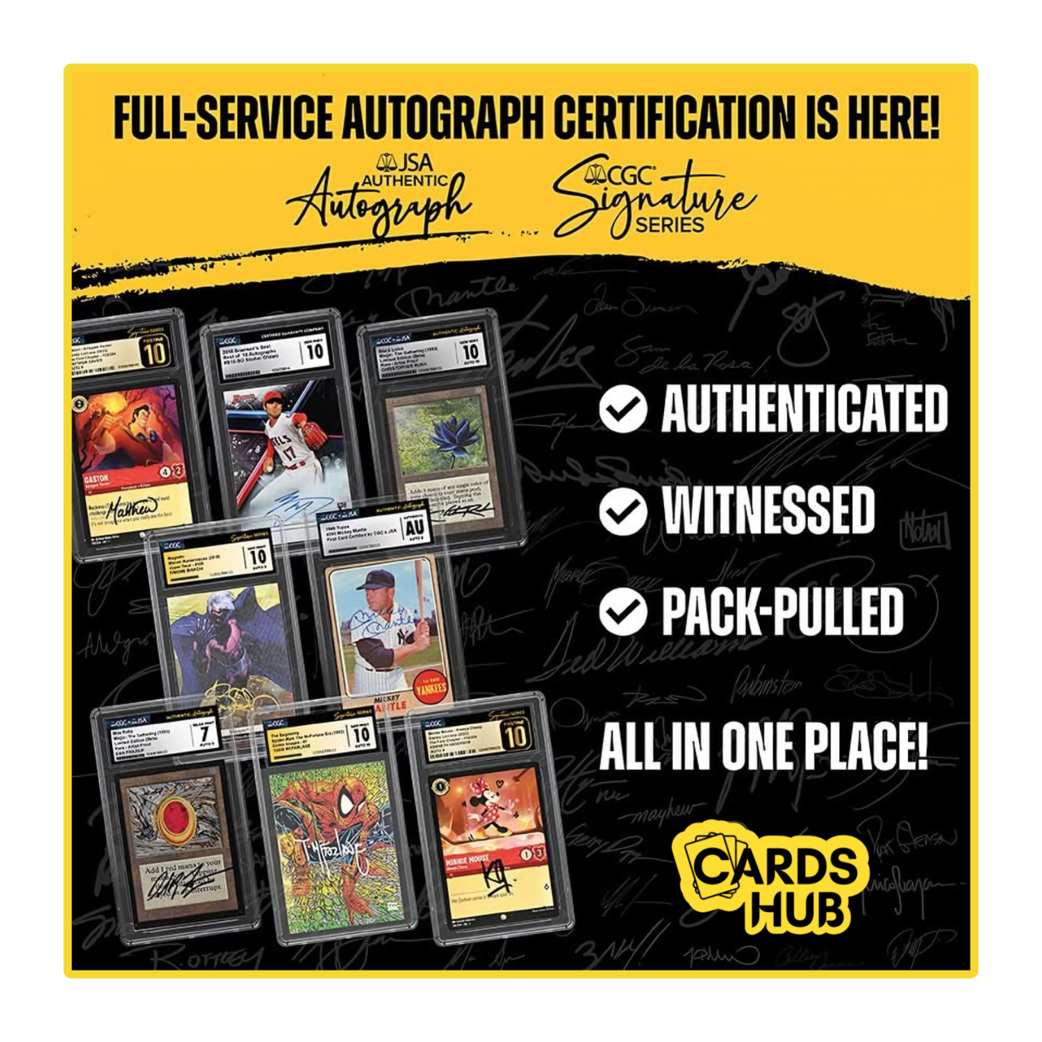 Servizio completo di autenticazione e grading dell’autografo per carte firmate non pack-pulled (firmate a mano, in fiera, etc.). Include la verifica della firma tramite JSA e il voto finale di CGC per qualità della carta e dell’autografo.